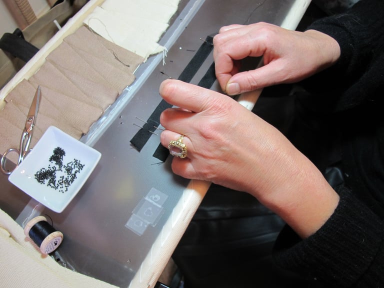 Argento 925, galuchat nero, nastro nero di seta ricamato.