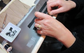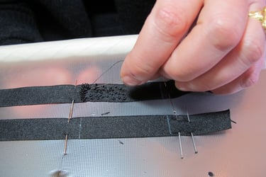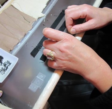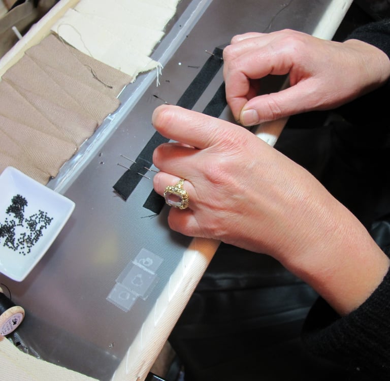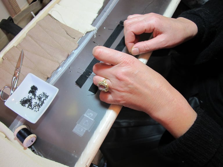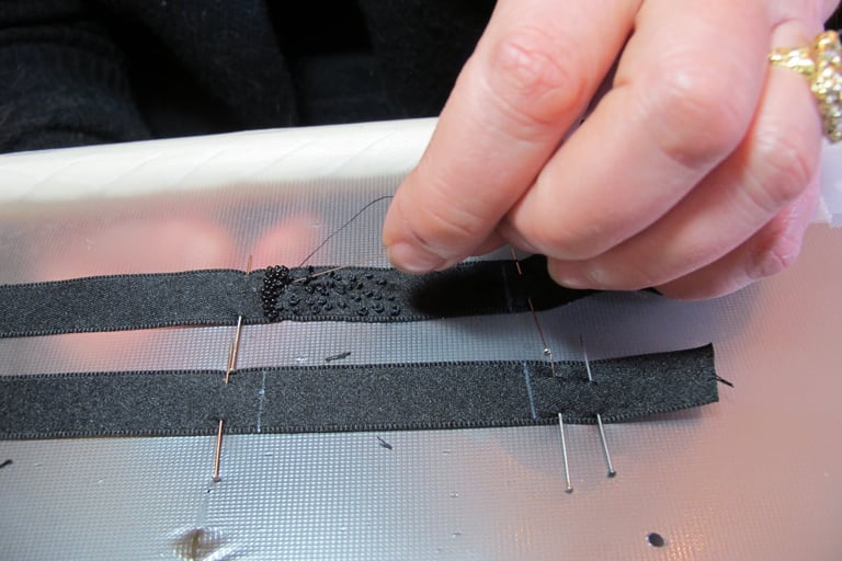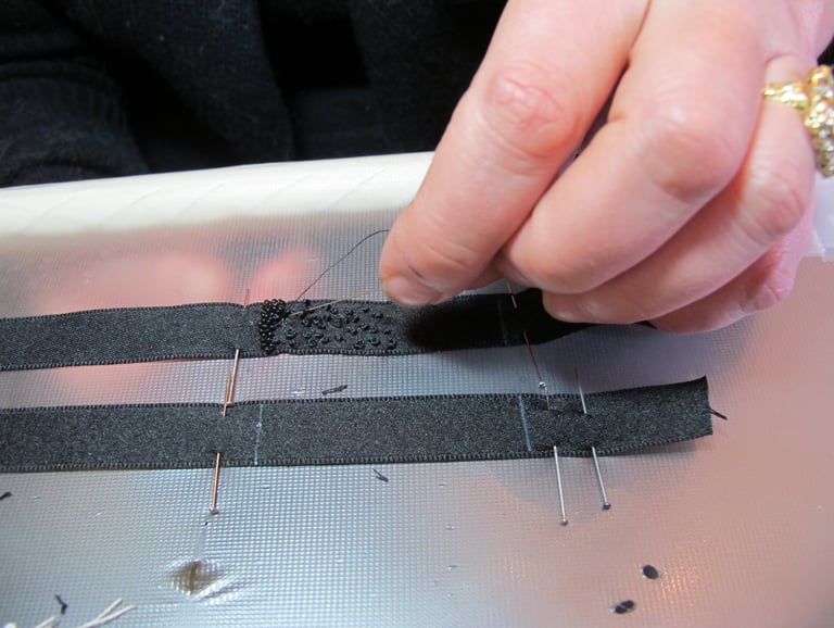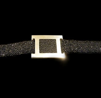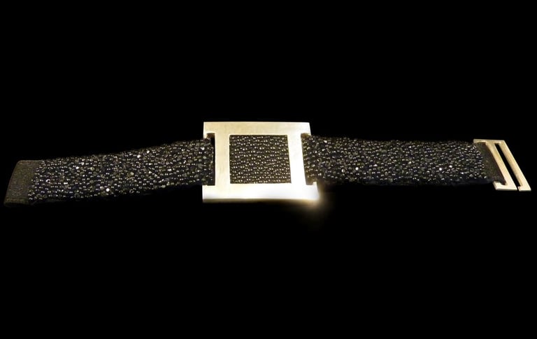 Argent 925, galuchat noir, ruban soi brodé points divers et billes anciennes.