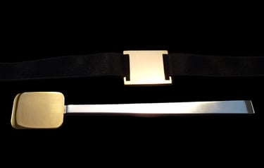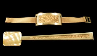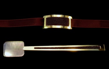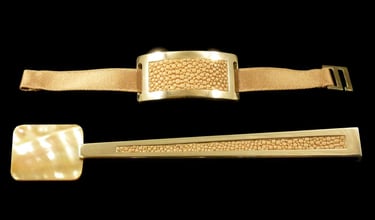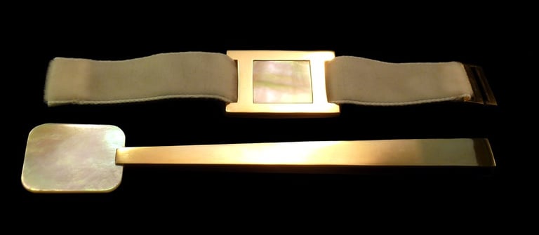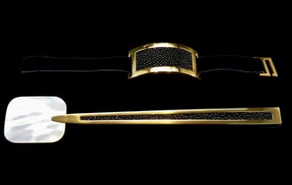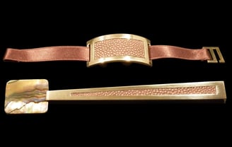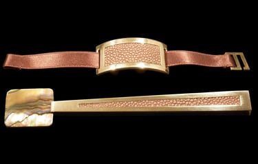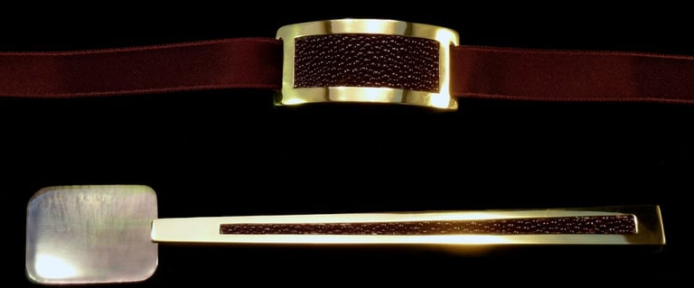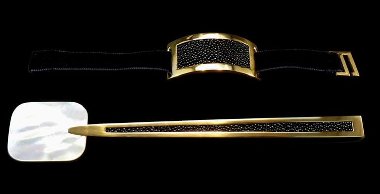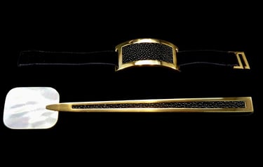 Cuillère à caviar et rond de serviette Mademoiselle Noir Or. Or, nacre blanche, galuchat noir, ruban velours noir.