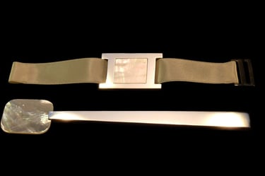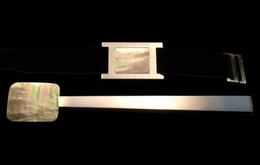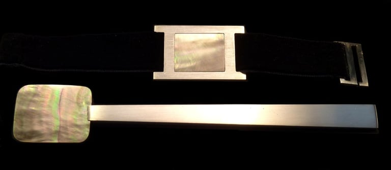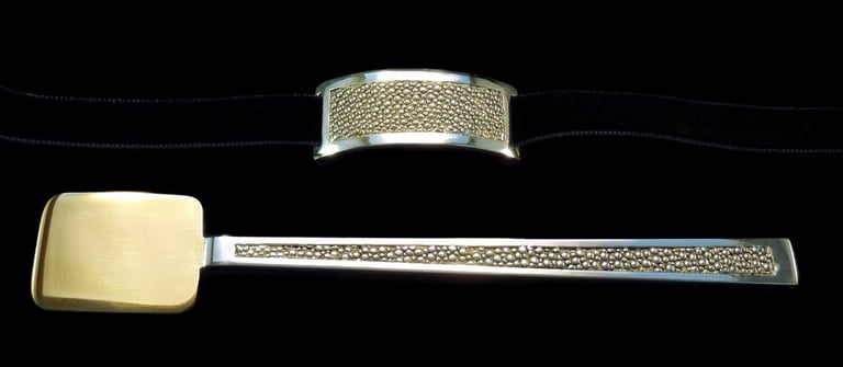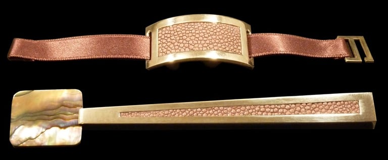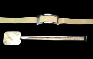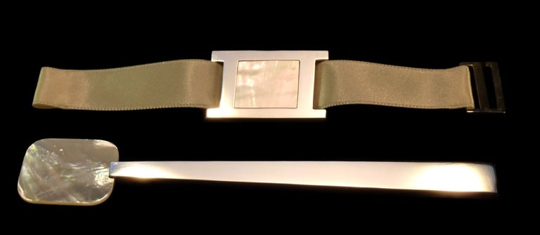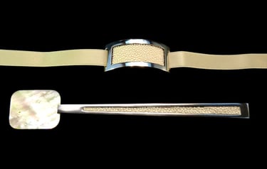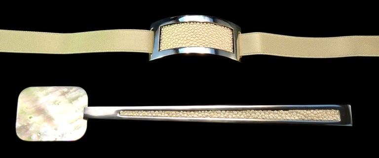 Cuillère à caviar et rond de serviette Mademoiselle Argent Nude. Argent 925, nacre glod, galuchat nude, ruban satin nude.