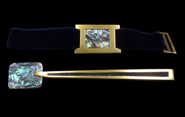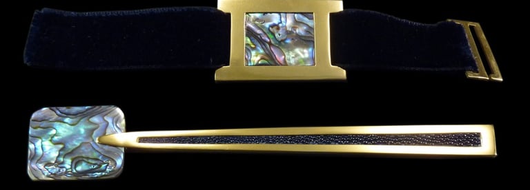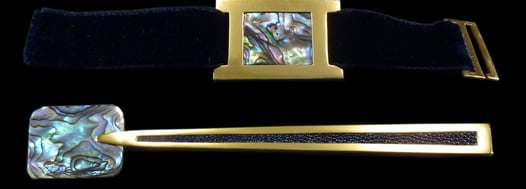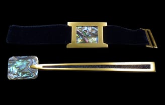 Cuillère à caviar et rond de serviette Mademoiselle H Abalon Or. Or, nacre abalon bleu, galuchat bleu, ruban velours bleu.