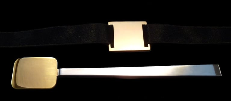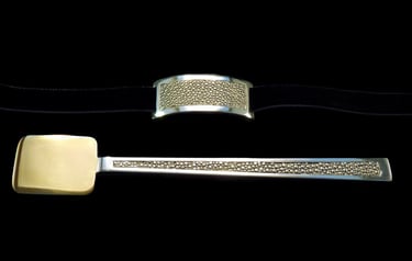 Cuillère à caviar et rond de serviette Mademoiselle Métal. Argent 925, vermeil, ruban velours noir.