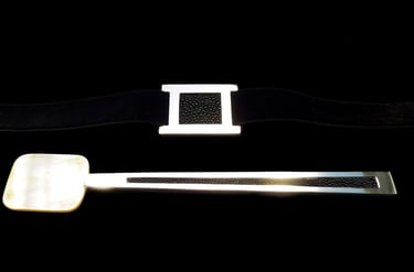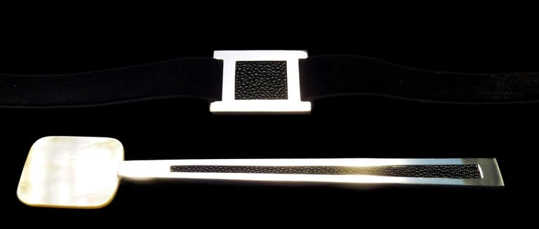 Cuillère à caviar et rond de serviette Mademoiselle Argent Noir. Argent 925, nacre blanche, galuchat noir, ruban velours noir.