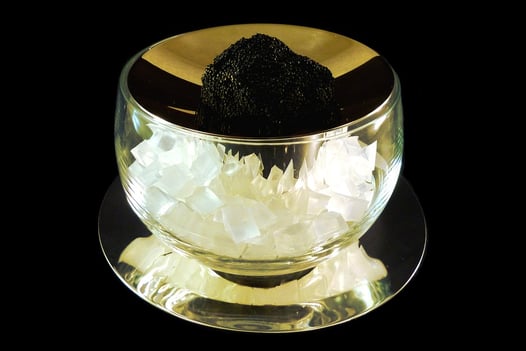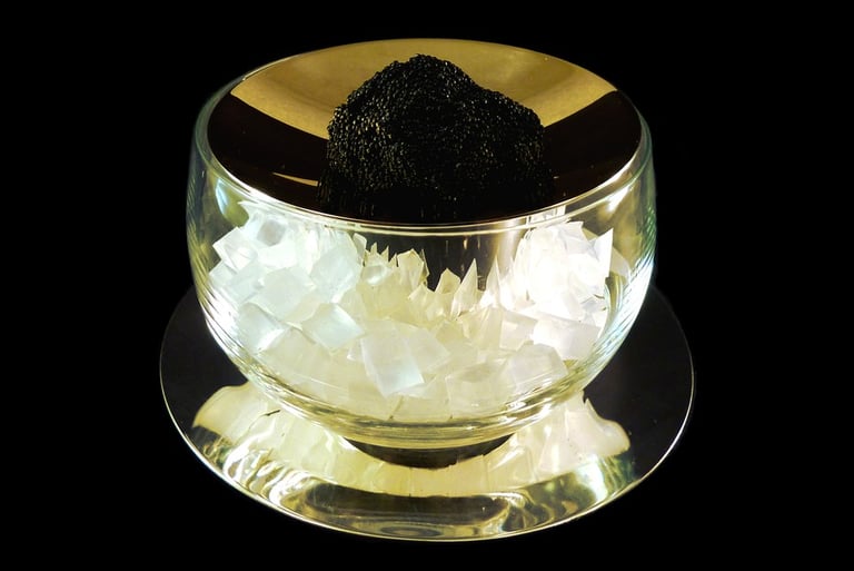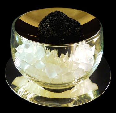 Service à caviar personnel H, metal argenté 925 et doré 18K, verre soufflé Murano.