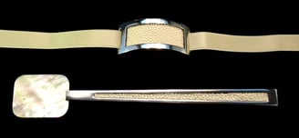 Caviar spoon and napkin ring Mademoiselle Argent Crème. Silver 925, white/creme mother of pearl, creme shagreen, creme satin ribbon.
