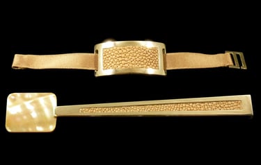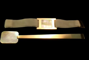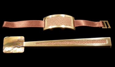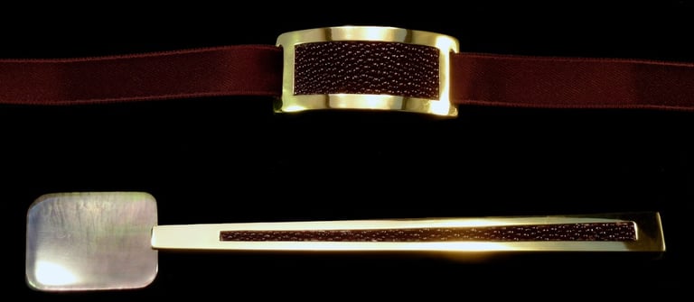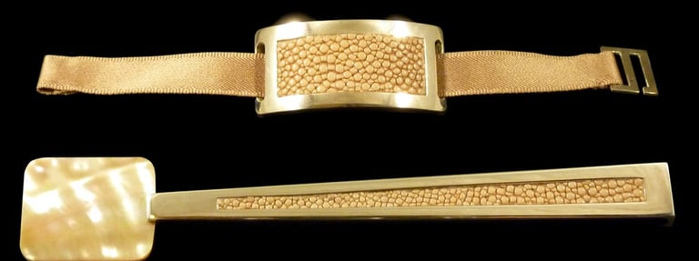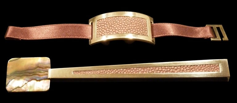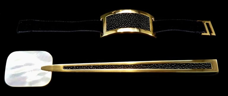Caviar spoon and nampkin ring Mademoiselle Noir Or. Gold 18k, white moder of pearl, black shagreen, black velvet ribbon.