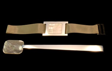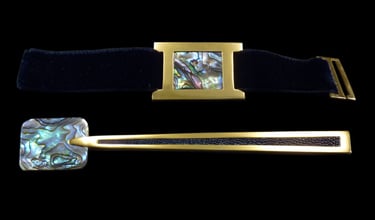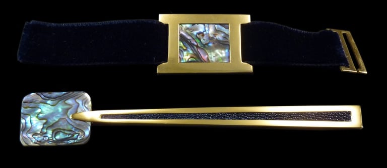 Caviar spoon and napkin ring Mademoiselle H Abalon Or. Gold 18k, blue abalon mother of pearl, blue shagreen, blue velvet ribbon.