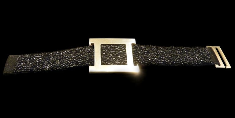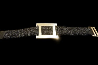 Silver 925, black stingray, enbroided silk ribbon.