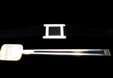 Caviar spoon and napkin ring H Argent Noir. Silver 925 brushed, black mother of pearl, black velvet ribbon.