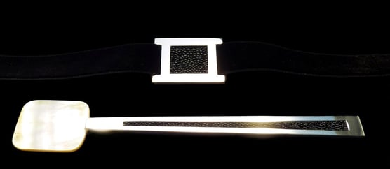 Caviar spoon and napkin ring Mademoiselle Argent Noir. Silver 925, white mother of pearl, black shagreen, black velvet ribbon.