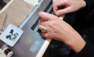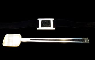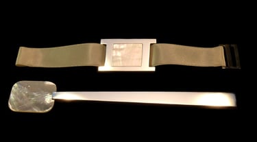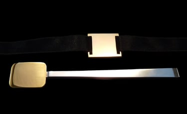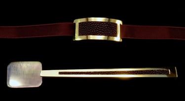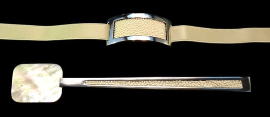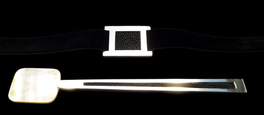 Argento 925, galuchat nero, nastro nero di seta ricamato.