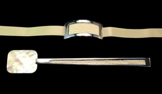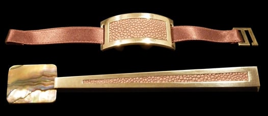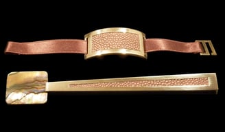 Cucchiaio caviale e portatovagliolo Mademoiselle Argent Nude. Argento 925, madreperla gold Pacifico Sud, galuchat nude, nastro raso nude.