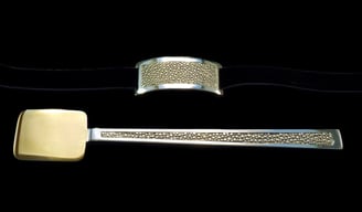 Cucchiaio caviale e portatovagliolo H Métal. Argento 925, e vermeil, nastro raso nero.
