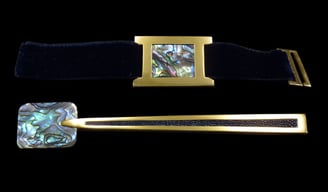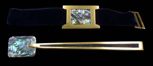 Cucchiaio caviale e portatovagliolo Mademoiselle Abalon Or. Oro 18k, madreperla abalone blu, galuchat blu, nastro di velluto blu.