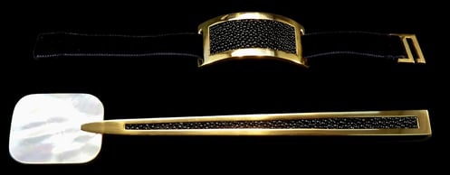 Cucchiaio caviale e portatovagliolo Mademoiselle Noir Or. Oro 18k, madreperla bianca, galuchat nero, nastro di velluto nero.